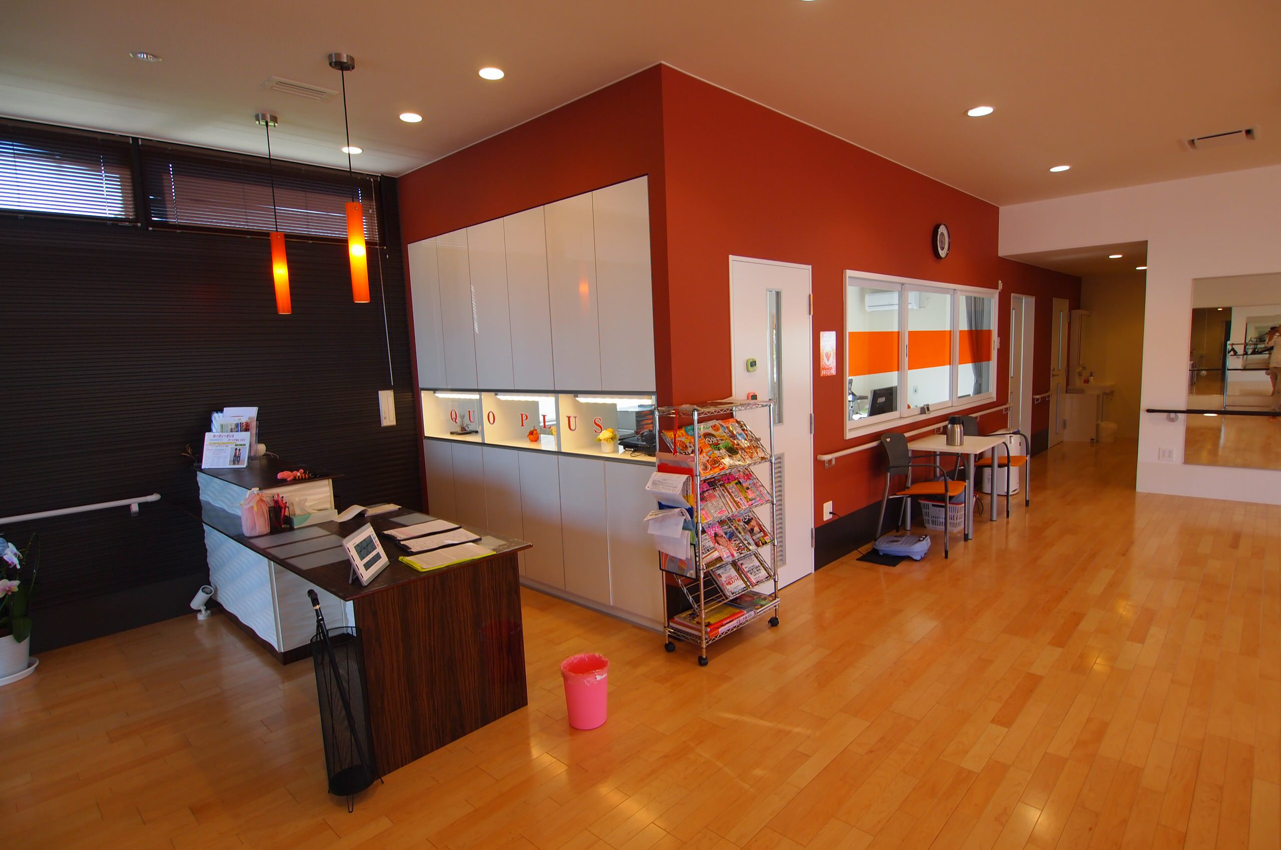 受付は、介護予防の利用者様でも高揚感で満たされる様にダンススタジオに合わせた雰囲気としています。